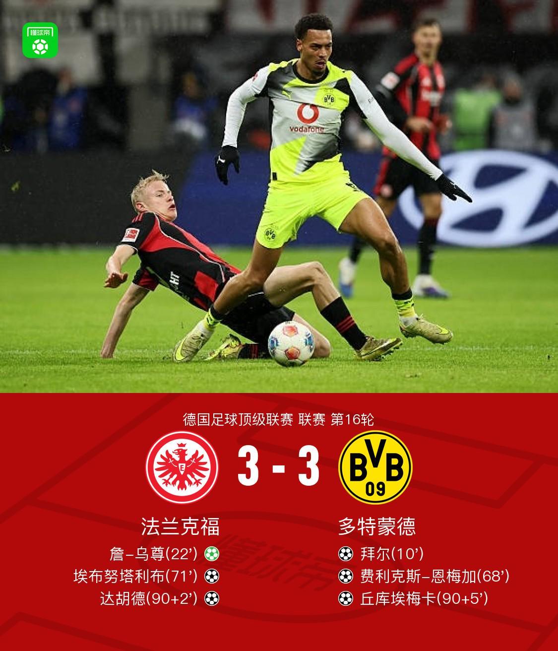 北京时间1月10日,德国足球甲级联赛第16轮展开较量,法兰克福坐镇主场迎战多特蒙德。上半场,拜尔率先破门。吉拉西送点,乌尊主罚命中。下半场,恩梅加破门,不过埃布努塔利布很快便通过单刀扳平比分。补时阶段,达胡德破门弑旧主。读秒阶段,丘库埃梅卡破门反绝平。全场比赛结束,多特3-3战平法兰克福。